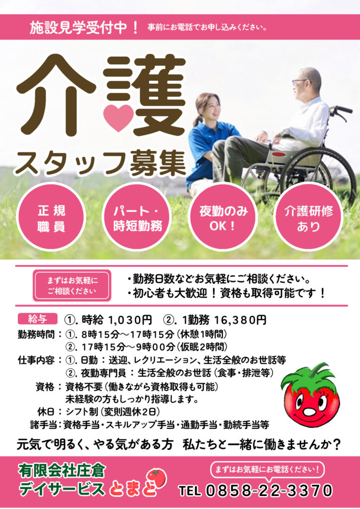 | 勤務地 | 有限会社 庄倉 デイサービスとまと 〒682-0034 鳥取県倉吉市大原602 |